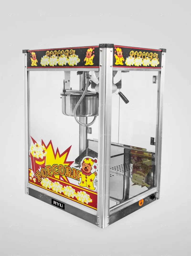 Este producto de la marca RYU para producir Pop Corn es uno de los más originales en el mercado en cuanto a proceso de alimento. Con su única característica de limpieza, saneamiento, fácil operación y ahorro de energía, este producto ha ganado muy buenas críticas de muchos clientes y ha llegado a ser la primera opción de compra en productos para eventos infantiles y otros, cines, restaurantes, snacks, centros de comida rápida, cafeterías y casinos. Ofrece un excelente merchandising con unos claros paneles en cristal. Adicionalmente cuenta con bandejas para la exhibición de productos el cual termina ayudando a las ventas. Fuertes puertas de plexiglass con una completa longitud de bisagras de acero niquelado para dar buena visión. Un claro lexan (resina de policarbonato) la cual provee de una mejor visibilidad este donde este localizada la máquina. Los gráficos de colores en la parte frontal impulsan las ventas.Características